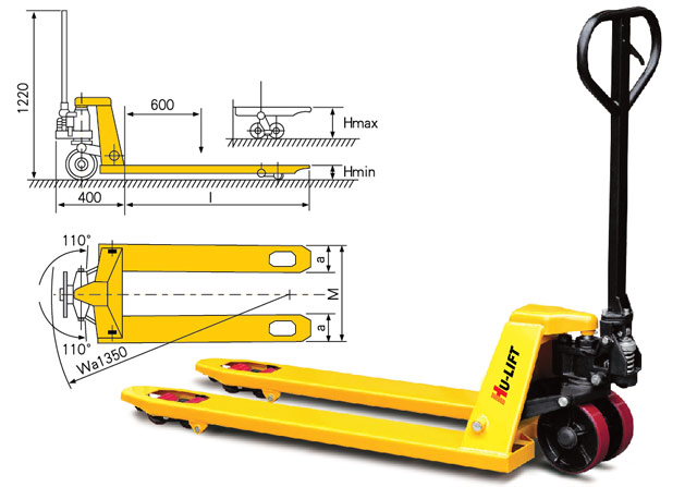 ◆貨叉最小Hmin/最大高度Hmax為75/195mm可選 ◆以上產品特殊貨叉長度可定制:800、1500、1800、2000mm ◆前輪標準配置為雙輪,單輪可定制 ◆后輪標準配置為聚氨酯(PU),另有尼龍輪、橡膠輪可定制